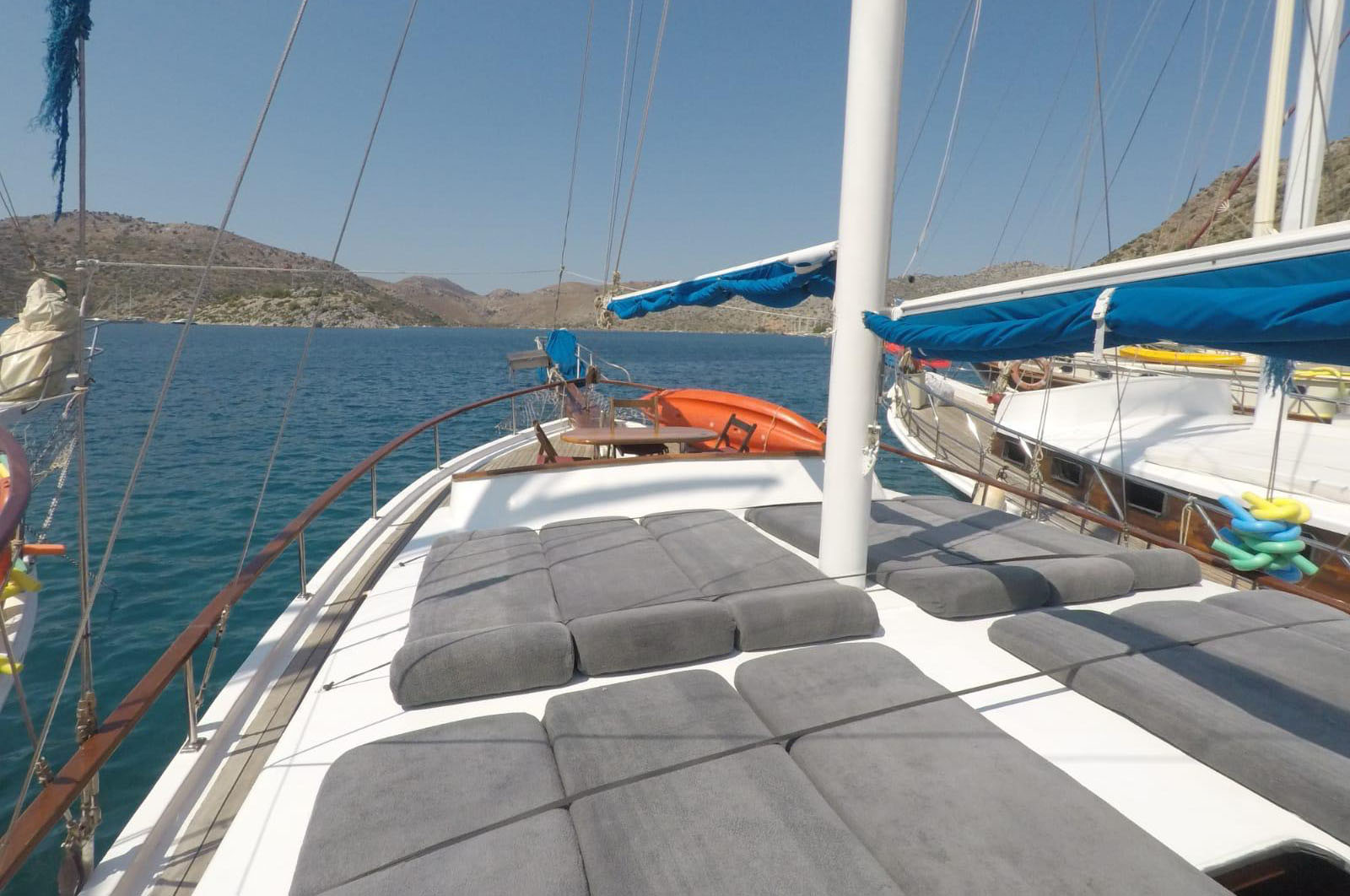Kabin / Yatak / Tip 6 Double Banyo Her kabinde duşakabin Tuvalet Her kabinde ev tipi Personel Kabini Var Müzik Sistemi Güverte ve salonda TV-Uydu Salon Elektrik 220 V, 24 V. Elektronik Sistemler Haberleşme cihazı, Derinlik ölçer, Radar, GPS, Pusula, Uydu haberleşme cihazı, Elektronik harita, Tüm seyir cihazları Klima Yok Gece klima kullanımı Yok Diğer Buz makinesi,CD – DVD Oynatıcı Yelken Donanımı Var Servis Botu Var Su Oyuncakları Kano |